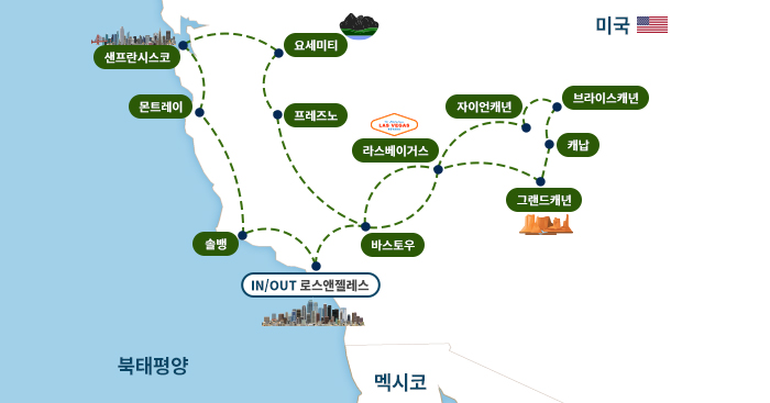 인천-로스앤젤레스(1)-바스토우/라스베이거스(1)-자이언캐년/브라이스캐년/페이지(1)-그랜드캐년/라스베이거스(1)-바스토우/프레즈노/차우칠라(1)-요세미티/샌프란시스코/산호세(1)-샌프란시스코/산호세(1)-몬트레이/솔뱅/로스앤젤레스-인천
